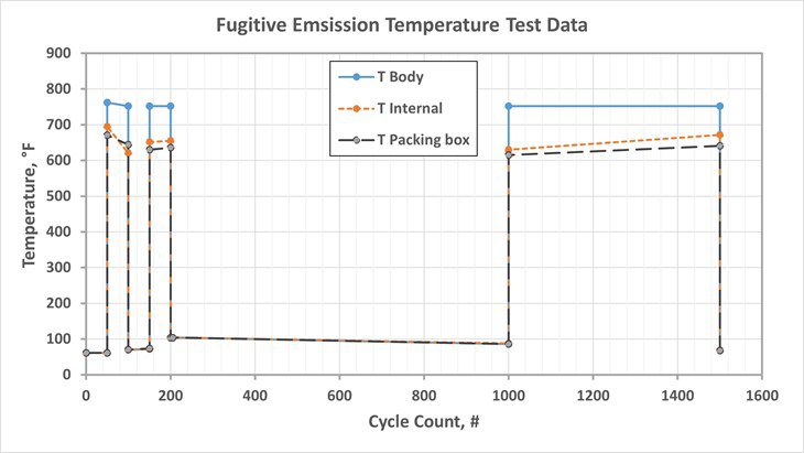 One common question end users ask is what is the temperature difference between the media and the packing? We have observed, in FE testing as shown in Figure 1, that the packing box temperature typically lags the body by a differential of approximately 100°F or 56°C as shown in Figure 2. However, in steady state conditions, the packing on some insulated heavy oils and delayed coking valves will operate at a much similar temperature than the media, which is considerably higher than the testing standards, in the range of 850°F/454°C and or above.
