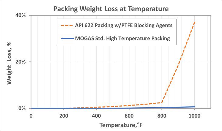 As clearly shown in Figure 4, the weight loss of the API 622 Packing increases exponentially over 800oF/427oC, while the standard high temperature packing weight loss remains linear and is much lower at the actual operating temperatures of heavy oils applications since it does not contain any PTFE blocking agents. What the graph cannot illustrate is the effect of the initial packing box pressure (internal packing stress) which is required to be typically twice as high for the API 622 packing.