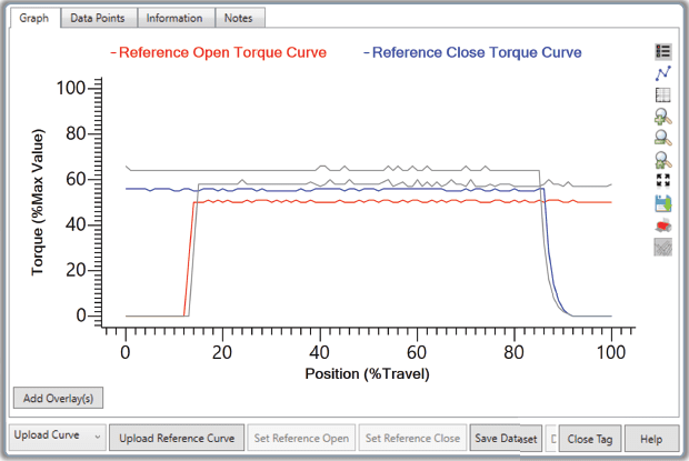 For example, Figure 4 shows a divergence between the reference and actual torque curve for both opening and closing, indicating a possible issue associated with actuator and valve assemblies. The degradation in torque while opening and closing can be an indication of valve, actuator components such as (electric motors, gearbox, drive train, etc.), or other issues. This type of chart can help trigger service or maintenance in advance of damage or failure.