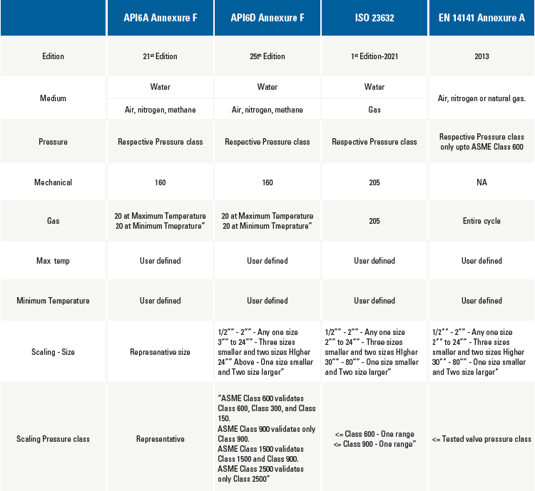 Various specifications covering these aspects have been released. The notable customer-based validations are Shell Type testing (MESC SPE 77/300 – procedure and technical specification for design validation testing of industrial valves, SNAM rete gas based on EN I4141 Annexure A, etc.,).